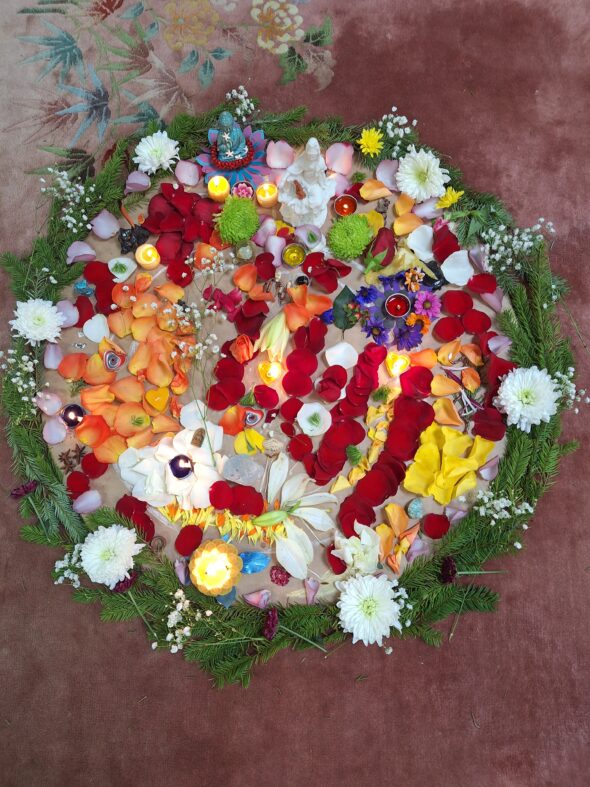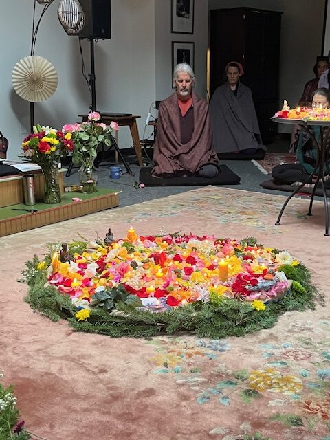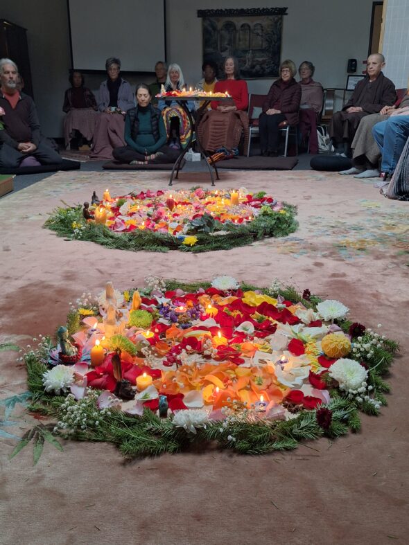 We had a full house of 35 people coming together to create a mandala in which intentions were placed via flowers and special objects by individuals. There was silence, a partially guided Metta/ Karuna meditation period, and time for socializing afterwards. Members brought treats and snacks for a lovely New Years spread served with tea.